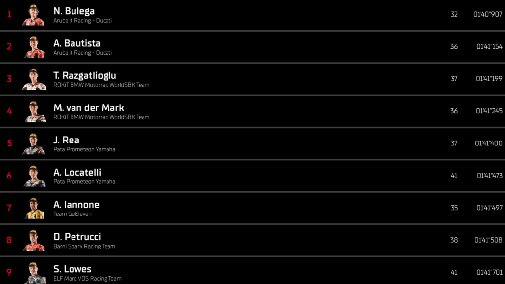 Il turco insegue le due Ducati a pochi millesimi di distacco dal campione in carica. Quarta posizione per Van Der Mark su BMW, il marchio tedesco si mostra in ottima forma, dando le giuste speranze per un ottimo weekend!