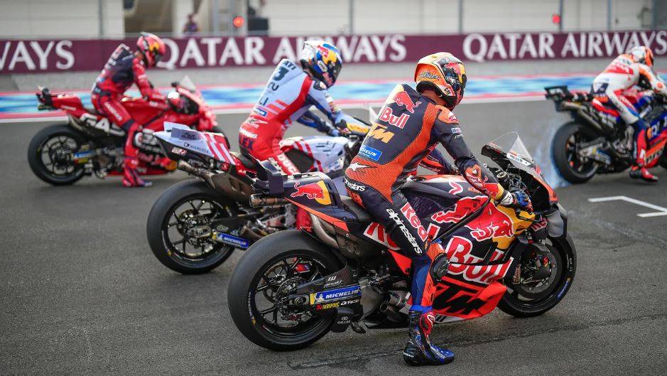 C’è una seconda tipologia di ali, spuntata sulle Aprilia per prime in alcuni test lo scorso anno, poi KTM, Honda e Yamaha (ma curiosamente, mai sulle Ducati). Queste sono molto facili da decifrare dato che sono delle ali da F1 in miniatura, e servono certamente a produrre carico. Quelle che paiono più estreme ed avanzate sono quelle di KTM, e non è un caso: dallo scorso anno il team di MotoGP collabora con quello di Red Bull F1 che in questo campo ha esperienza da vendere. Ecco che quindi la loro ala posteriore ha profili multipli e forme molto evolute, specie quest’anno. Honda e Yamaha hanno superfici singole, Aprilia ha portato varie soluzioni nei test ma poi in gara è comparsa senza. Queste ali servono quindi a premere la coda della moto verso il basso, e possono produrre verosimilmente qualche decina di kg di carico alla massima velocità. Iniziano a lavorare efficacemente in accelerazione, mano a mano che la velocità sale, dando più grip alla gomma posteriore. Ricordiamolo: più grip significa meno necessità di “taglio” da parte dell’elettronica e quindi più potenza messa a terra. E qui c’è un punto che è interessante: lo spinning. Un telemetrista di MotoGP vi dirà che la moto sta sempre spinnando, cioè la gomma fa più giri di quelli che servono ad avanzare. Sta sempre almeno un po’ sgommando, diciamo. Quanto? E’ sorprendente ma anche sul dritto ci può essere un 5% di spinning. In accelerazione anche il 15%. Quando vedete derapare e fumare la gomma siamo ben oltre questi numeri, che invece sono del tutto normali, e spiegano anche il perché si generino temperature enormi sulla gomma.