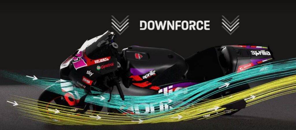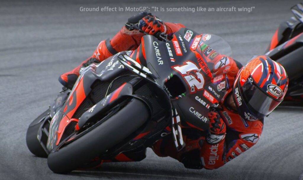 Parliamo ora di una delle ultime novità, questa volta introdotta lo scorso anno da Aprilia, e poi copiata in modi diversi: la fiancata ad effetto suolo. Aprilia portò delle strane fiancate che erano insolitamente larghe, e che sembravano disegnate per essere parallele all’asfalto a piega massima. Non sembrava così, lo era. Sono superfici il cui scopo è avere un flusso veloce di aria, tra la fiancata e il terreno. Flusso veloce significa bassa pressione, e quindi un effetto di schiacciamento, di risucchio che aumenta il grip. E’ usato ampiamente in F1, e necessita una distanza controllata per funzionare, mentre in MotoGP è efficace solo in alcune curve, ma se il vantaggio esiste, anche minimo perchè non coglierlo? Interessante notare che Aprilia non abbia i “downwash ducts” perchè ha disegnato la fiancata per massimizzare invece l’effetto suolo, sacrificando evidentemente altro. Ducati viceversa ha lavorato per incanalare verso il basso i flussi, a discapito dell’effetto suolo, ma la nuova tendenza a creare flussi interni alle carene potrebbe essere la nuova frontiera per le evoluzioni future. KTM quest’anno pare molto aggressiva, pare stia cercando di incorporare sia i downwash ducts che l’effetto suolo, ed ha nella parte bassa una sorta di nervatura, di sporgenza, che serve a dividere i flussi in piega massima. E’ così estrema che a Portimao abbiamo visto Acosta grattare la carena sul lato destro in modo evidente, come succedeva con le minigonne delle F1!