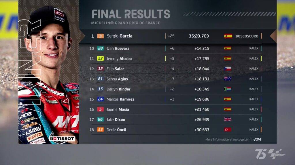 A Le Mans il campionato del mondo Moto2 ha corso il quinto round stagionale. Una corsa che si è accesa nel finale, che ha visto prevalere Garcia – che sale in testa alla classifica piloti – e Ogura. Storica doppietta MT Helmets – MSI, terzo Lopez. Nessuna Kalex nei primi tre: non accadeva da 10 anni