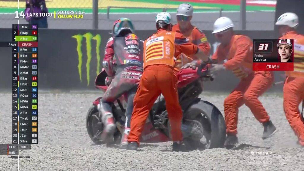 Gara magistrale, nonostante la caduta, di Pedro Acosta. Il fenomeno della KTM รจ caduto a curva 10 (la famosa curva del conad, come la rinominรฒ Valentino Rossi nel 2019) mentre era attaccato agli scarichi di Jorge Martin. Pedro ritira su la sua RC16 dalla ghiaia e riparte, arrivando in piena zona punti (13ยฐ) e davanti a tutte le Honda.