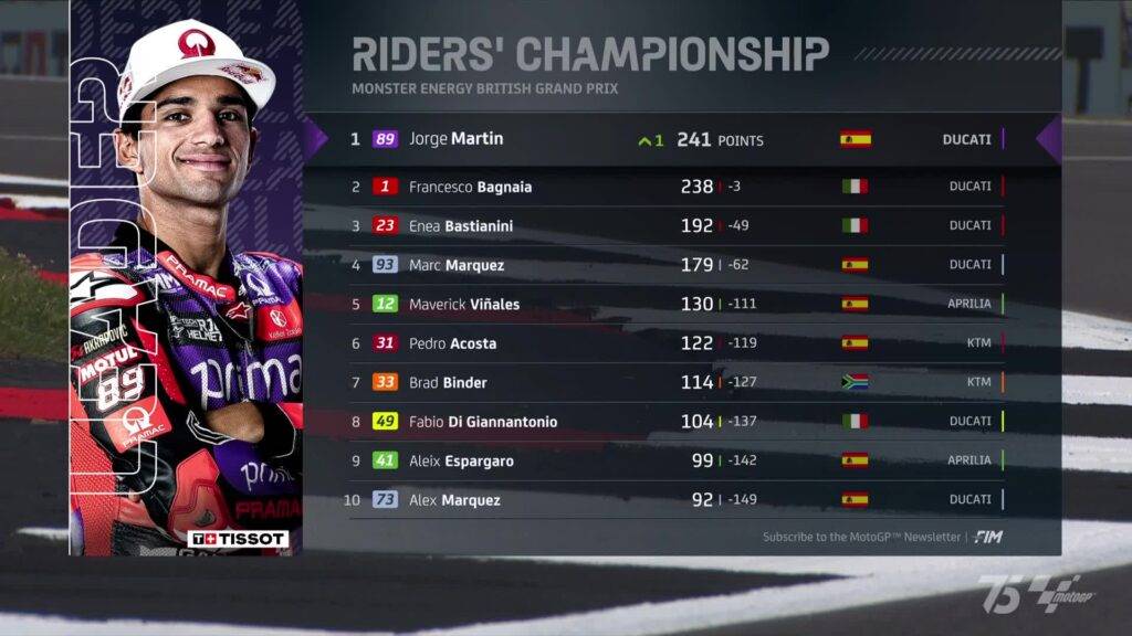 A Silverstone grande prova di forza di Enea Bastianini, che si conferma imbattibile e impeccabile nell’ultima fase di gara: relega Martin al secondo posto e vince con distacco. Bagnaia terzo, adesso a tre punti dallo spagnolo nel mondiale