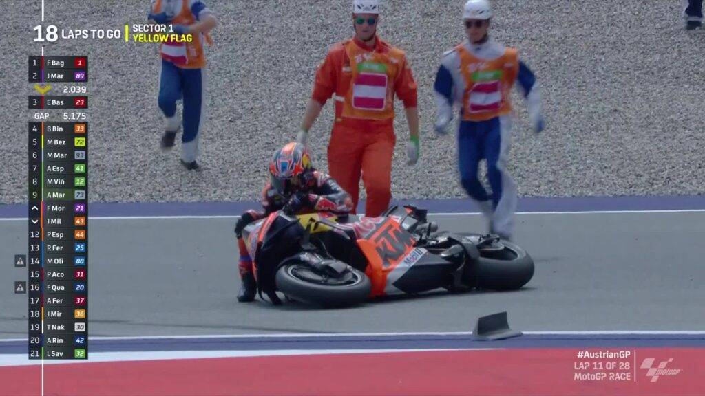 Difficile situazione in casa KTM. L’unico che riesce a stare davanti, concludendo quinto, è Brad Binder mentre gli altri sono costretti ad accomodarsi fuori dalla top10. Cade Jack Miller nelle fasi iniziali in un Gran Premio dove poteva davvero fare molto bene. In difficoltà per tutto il weekend Pedro Acosta, che probabilmente paga inesperienza e una moto tecnicamente inferiore rispetto alle Ducati.