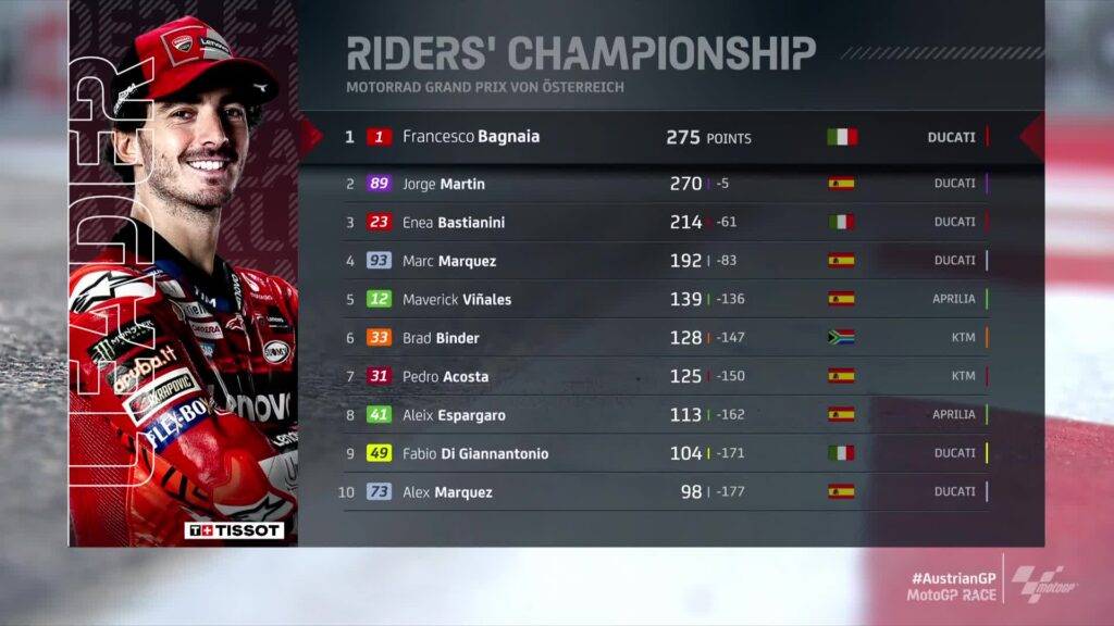 Con questa vittoria Pecco sorpassa di nuovo Jorge Martin in classifica aumentando di 5 punti il gap. Consapevole di aver dato allo spagnolo una bella risposta dopo un weekend non andato benissimo a Silverstone, dove a sua volta era stato sorpassato. “È stata una gara tiratissima. Ho provato a mettermi davanti subito perché sapevo che il mio ritmo era buono. Cercavo di gestire un passo che fosse un pelino più veloce di quello di Martin. Lui mi è venuto dietro e quindi sapevo che nel finale non ne avrebbe avuto per arrivarmi sotto.”