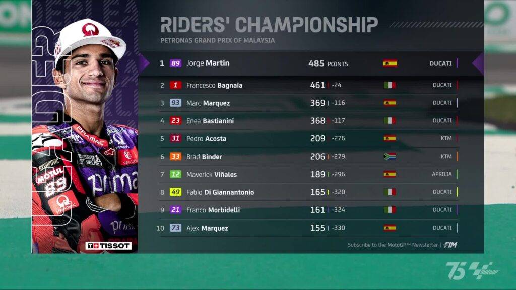 Adesso si va a Barcellona. Valencia non รจ ovviamente stata possibile da disputare per la situazione disastrosa dell’ultima settimana causata dall’alluvione. Si deciderร tutto lรฌ. 24 punti di ritardo che Jorge Martin puรฒ permettersi di amministrare senza troppi problemi. ร stato piรน costante, anche se forse meno veloce. Soltanto tre vittorie (Portimao, Le Mans e Mandalika), e un sacco di podi (uniti a pochi errori) che gli hanno garantito la costanza giusta per presentarsi da leader e super favorito all’ultimo gong.