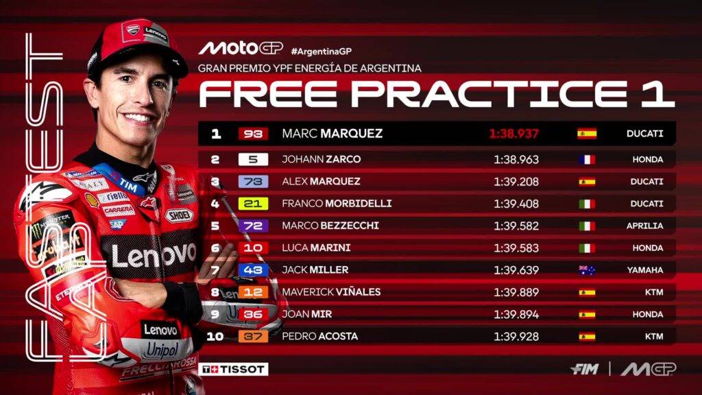 Marc Marquez il più veloce della prima sessione della MotoGP a Termas de Rio Hondo. In top10 anche Zarco e Bezzecchi. Bagnaia in grossa difficoltà con il posteriore. Tutto quello che è successo