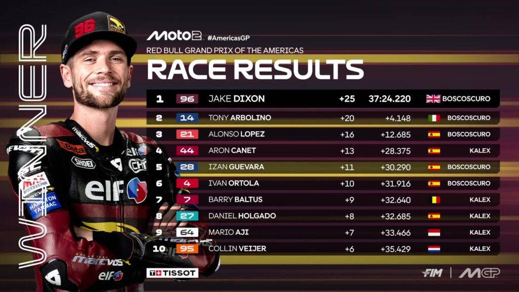 Un dominante Jake Dixon su MarcVDS si conferma il pilota piรน in forma del momento in Moto2 e dopo la straordinaria vittoria a Termas si conferma anche ad Austin, anche sul bagnato. Il pilota inglese si porta a casa una vittoria mai in dubbio per tutti i 16 giri, senza dare speranze agli avversari. Dietro di lui troviamo un grande Tony Arbolino, che conferma le sue grandi capacitร su pista bagnata e si porta a casa un ottimo 2ยฐ posto. Chiude poi il podio un convincente Alonso Lopez anche lui gestendo. Torna a casa quindi con una medaglia di bronzo mai messa in pericolo da un 4ยฐ Aron Canet abbastanza spento per tutta la gara.
