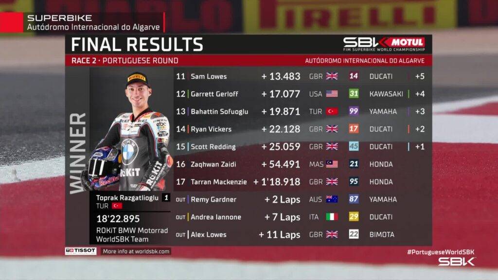 Dietro a Michael Van der Mark, quinto, ricostruisce una gara che sembrava andata in fumo Danilo Petrucci, che porta la sua Panigale V4 R al sesto posto. Bella sorpresa anche la prestazione di Axel Bassani, settimo, che ottiene il miglior risultato stagionale. Top 10 poi chiusa da Iker Lecuona, Dominique Aegerter e Yari Montella.
