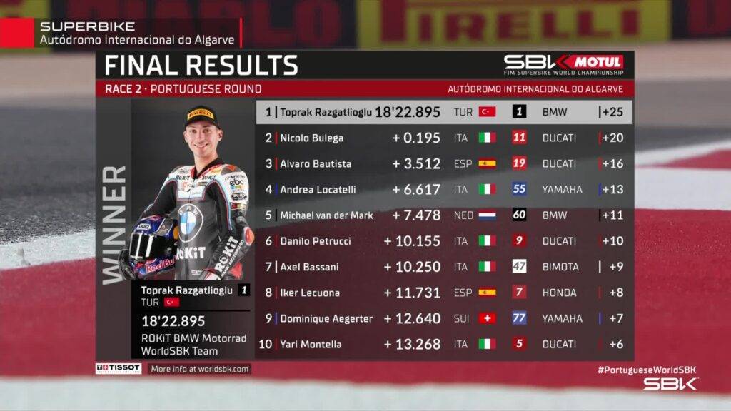 Toprak Razgatlioglu non si accontenta e fa sua anche Gara2 del WorldSBK, dopo un nuovo bellissimo duello con Nicolรฒ Bulega. Alvaro Bautista prova a rimanere con i primi due ma si deve accontentare della medaglia di bronzo.