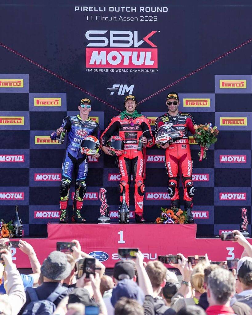 Nicolรฒ Bulega fa un altro sport ad Assen e vince Gara 1 del WorldSBK, guidando una tripletta tutta italiana sul podio: Andrea Locatelli porta la Yamaha sul secondo gradino davanti a Danilo Petrucci. Razgatlioglu in difficoltร nel finale di gara chiude quarto.