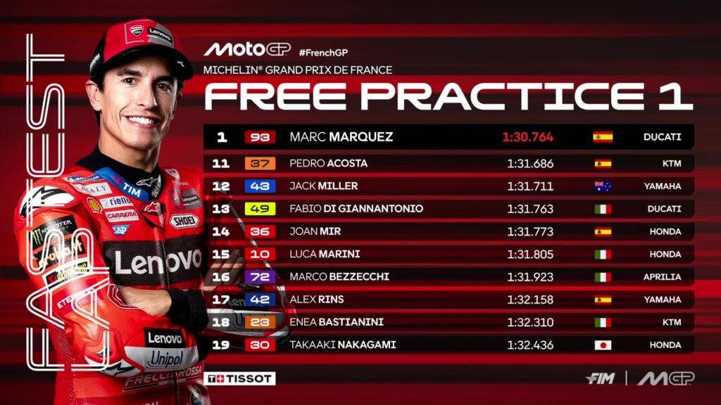 Torna a fare la voce grossa in MotoGP Marc Marquez. Dopo l’errore di Jerez in cui ha regalato al fratello e a Pecco Bagnaia tanti punti, lo spagnolo รจ tornato sulla sua Desmosedici piรน carico che mai, e le FP1 sono state la prima occasione per rimarcare la sua superioritร . Marc รจ stato l’unico della sessione ad infrangere il muro dell’1:31, fermando il cronometro sul tempo di 1:30.764. Il record di tutti i tempi del tracciato di Le Mans, per essere solo delle FP1, non รจ affatto lontano. Nel 2024 infatti Jorge Martin aveva fatto la pole con il tempo di 1:29.919.