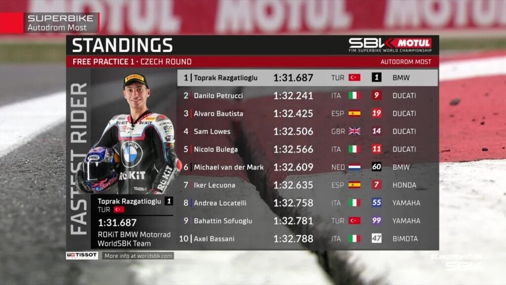Toprak Razgatlioglu è stato perciò il più veloce di questa rocambolesca FP1, confermando l’ottimo feeling tra lui e questa pista. Danilo Petrucci è secondo davanti ad Alvaro Bautista e Sam Lowes. Iker Lecuona è il primo delle Honda con il settimo tempo, mentre stupisce in positivo Bahattin Sofoglu, che con il nono tempo per la prima volta quest’anno si affaccia nelle prime posizioni di classifica.