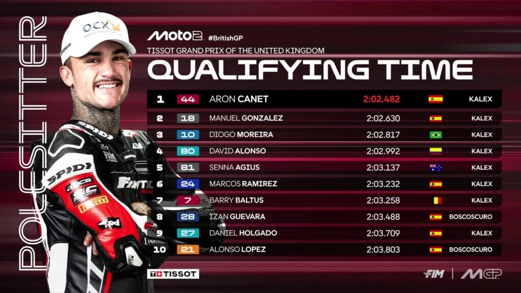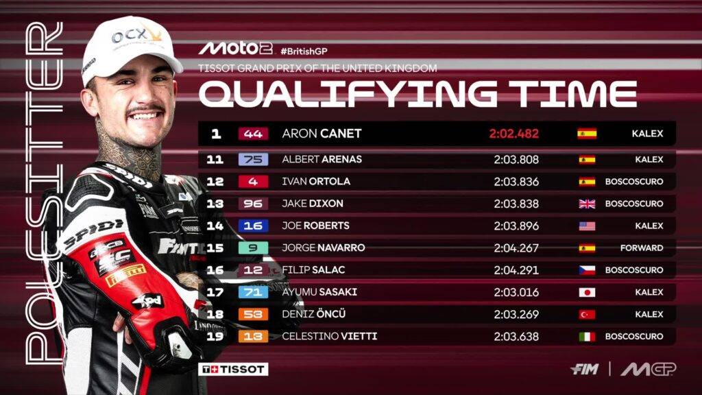 Aron Canet firma la pole position del GP di Silverstone della Moto2, arrivando dal Q1. Manuel Gonzalez e Diogo Moreira completano la prima fila. L’idolo di casa Jake Dixon delude con il tredicesimo tempo, male anche gli italiani: esclusi dal Q2 sia Celestino Vietti che Tony Arbolino.