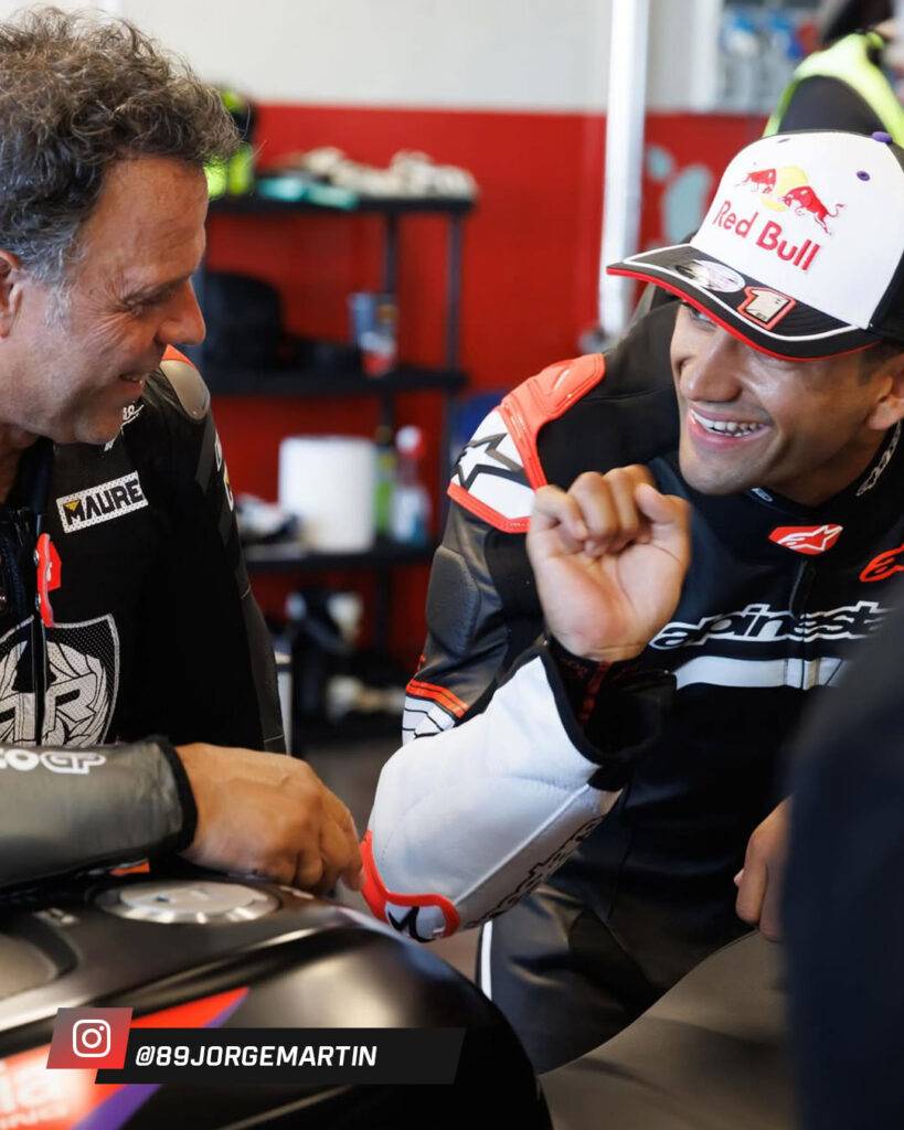 Jorge avrebbe dovuto soltanto “fare presenza” senza scendere in pista, ma una volta arrivato nel paddock del World Circuit Marco Simoncelli il richiamo della moto è stato troppo pesante. Jorge, che non si era portato l’attrezzatura per andare in moto, è andato in un negozio a Morciano (Motostorm, in provincia di Rimini) dove ha comprato tuta, casco e guanti per poter guidare la Aprilia RS660 Factory.
