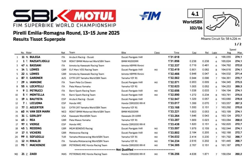 Per la prima volta, una Superbike è scesa sotto al muro del “32 a Misano, 1:31.618 è infatti il nuovo all-time record del tracciato romagnolo. Da applausi anche il pilota BMW, pure lui in grado di fare un tempo simile ma non sufficiente per mettersi davanti a Nicolò. Per il turco però la soddisfazione è arrivata poco dopo il termine della Superpole.