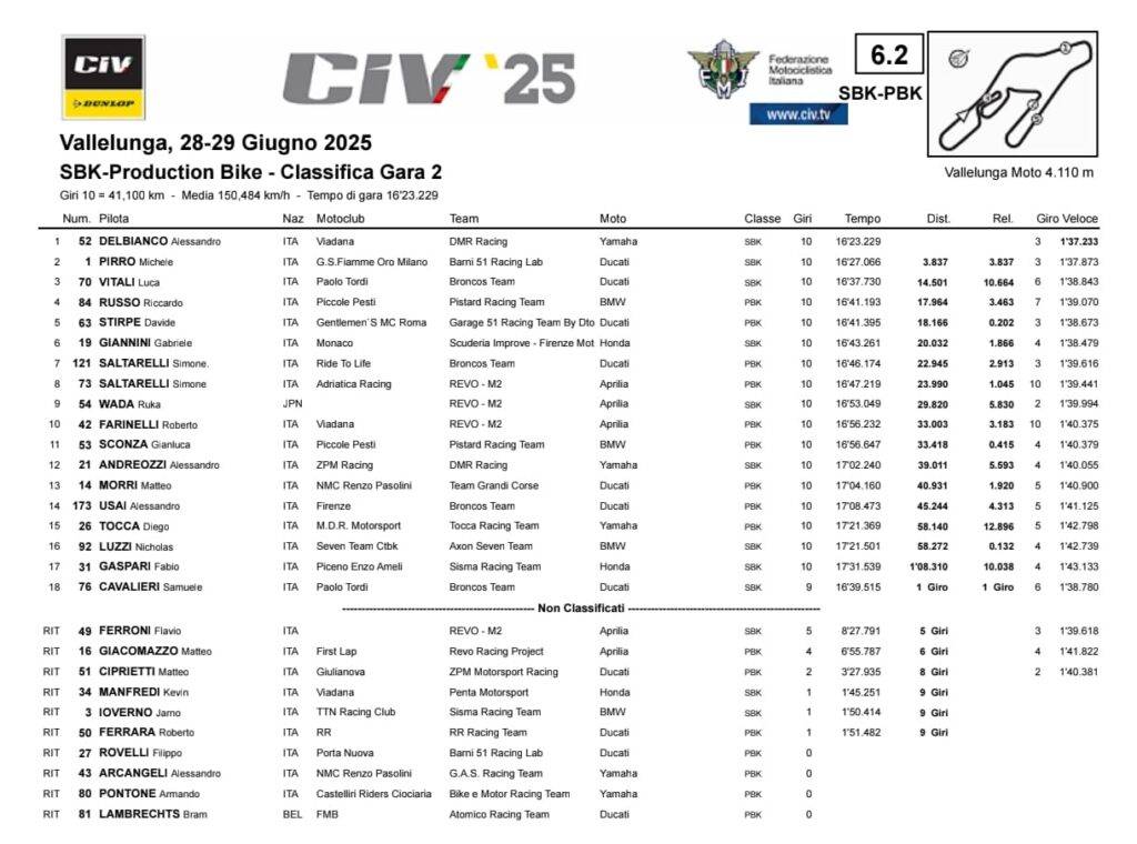 Alessandro Del Bianco fa bottino pieno a Vallelunga, e si porta a casa la seconda doppietta stagionale del CIV Superbike. Michele Pirro ci prova nei primi giri ma non può nulla davanti allo strapotere del romagnolo, podio per Luca Vitali con la Ducati del Broncos Racing. Riccardo Russo vince ancora in Production Bike.