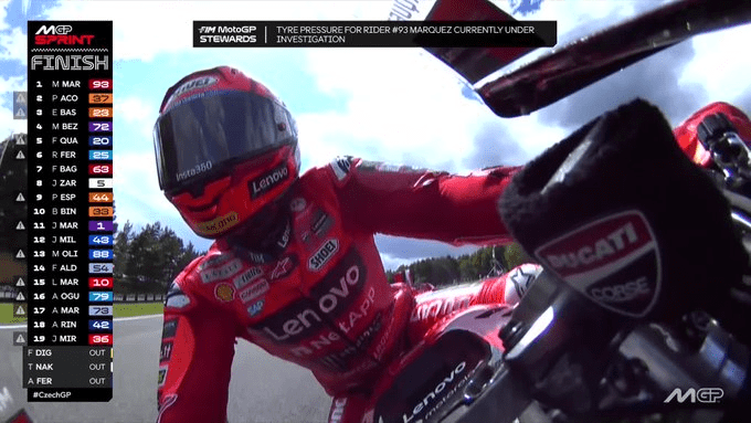 Durante la corsa della Sprint race Marc Marquez e Pecco Bagnaia hanno dovuto fare passare gli altri piloti solo per avere una scia calda davanti. È questo quello che bisogna fare per non procurarsi una penalità per colpa della pressione della gomma troppo bassa.