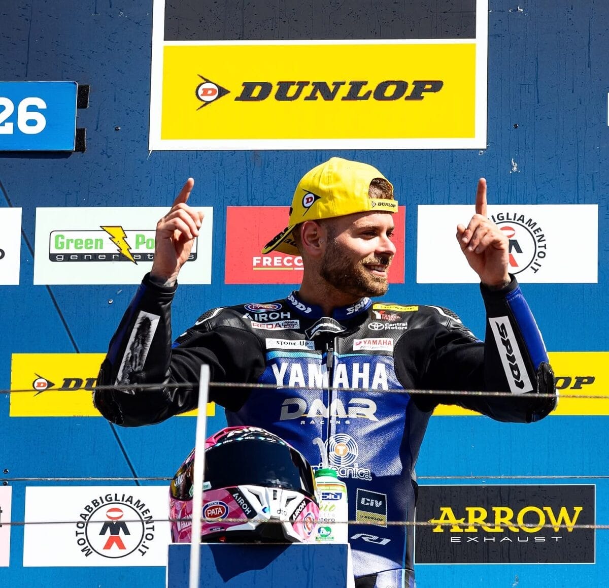 Il pilota del team DMR Yamaha ha chiuso in 22’30”322, vincendo con 6.286 di vantaggio su Gabriele Giannini e con 7.998 su Michele Pirro. Un margine pesante, che racconta molto bene il livello espresso per tutta la corsa. Delbianco non si è limitato a controllare: ha preso in mano la gara e l’ha portata dove voleva lui, senza lasciare davvero la sensazione che qualcuno potesse mettergli le mani addosso.
